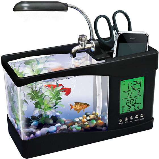 Além de ser um aquário legal, tem também um porta-treco para guardar besteiras e um relógio digital para você ficar acompanhando a hora, torcendo para chegar logo o fim do expediente.